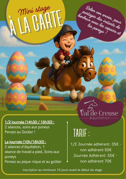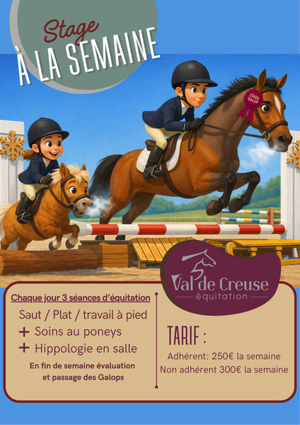 Chaque vacances scolaire permet l'organisation de stage afin de permettre aux cavaliers de découvrir une nouvelle discipline, de se perfectionner, de préparer une échéance sportive, de faire une randonnée ou bien de passer des galops.